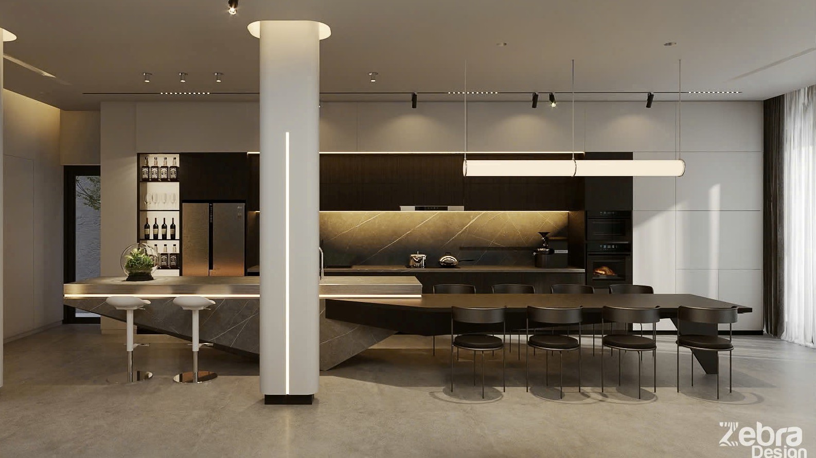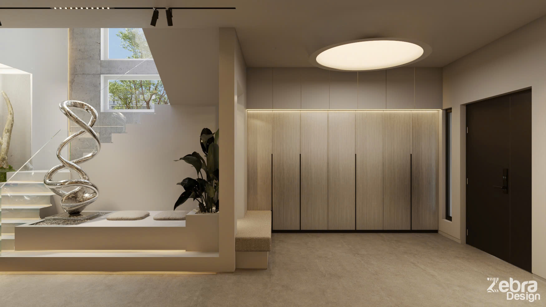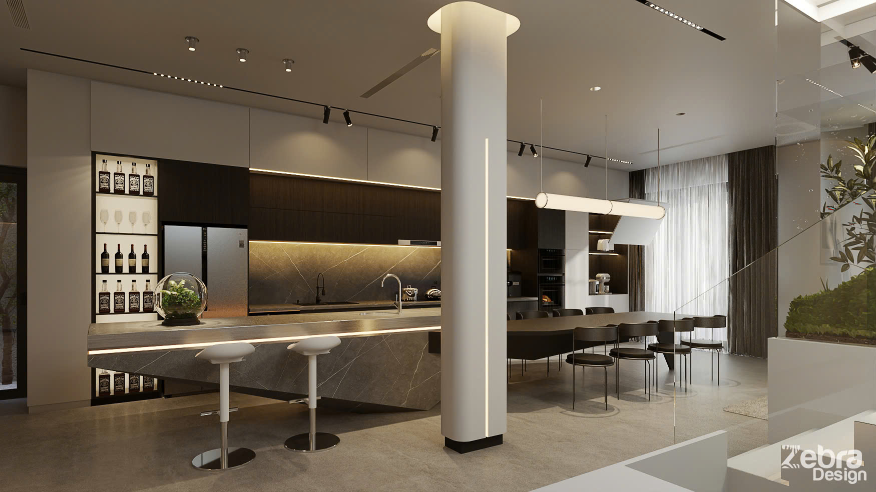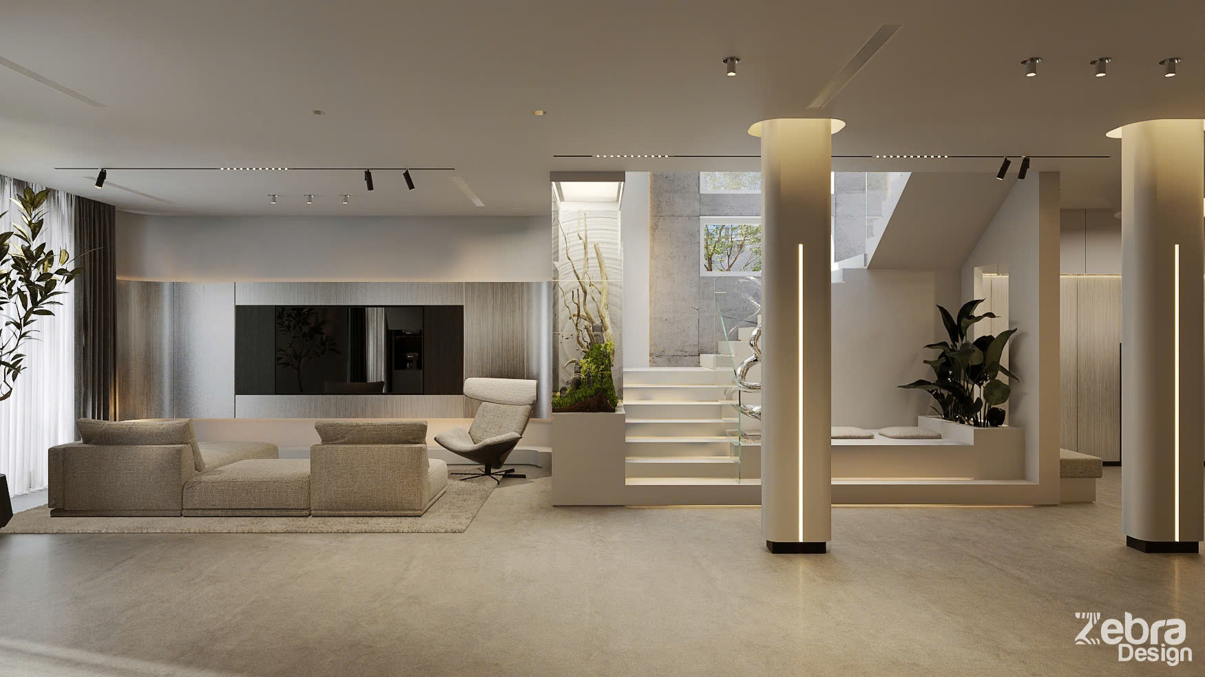 Không gian mở được tổ chức theo trục xuyên suốt với nhiều đường thẳng, tối ưu ánh sáng tự nhiên và tính liên kết công năng. Vật liệu trung tính, ít màu sắc được chọn lọc kỹ lưỡng, nhấn mạnh tỷ lệ, bề mặt và ánh sáng để tạo chiều sâu thị giác.